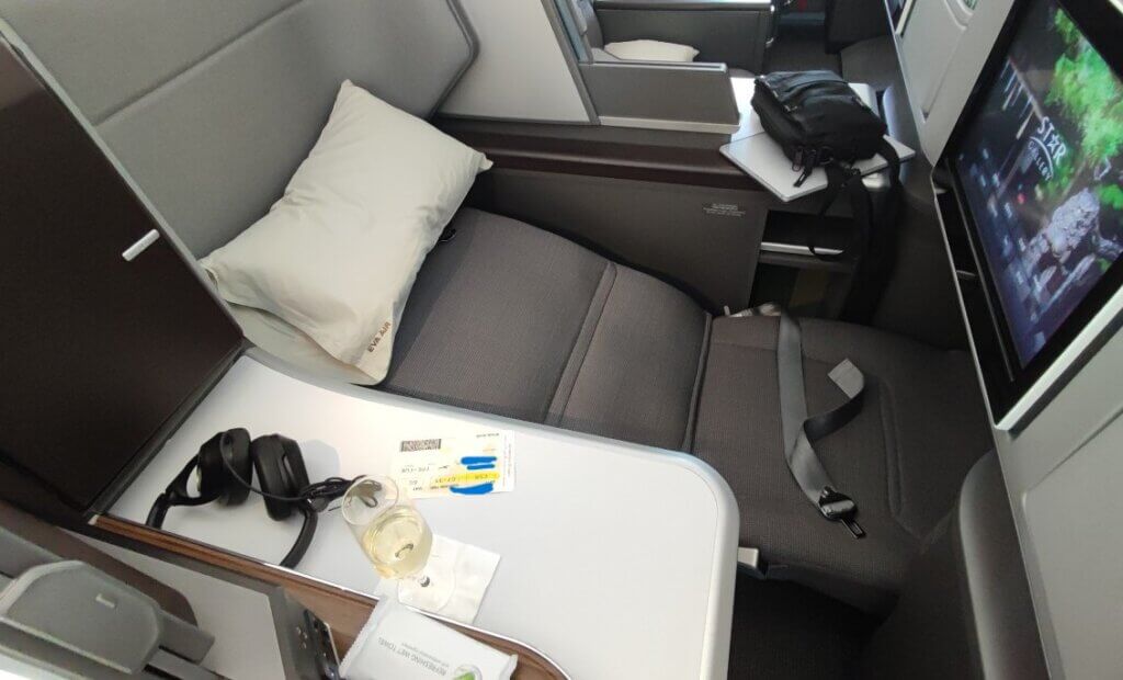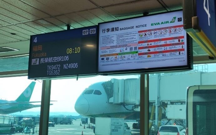 台北桃園国際空港から福岡国際空港へ向かうフライトは、エバー航空(EVA AIR)BR106便のビジネスクラス。